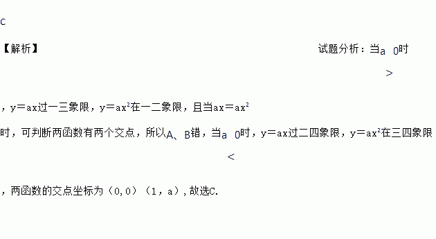 C 【解析】试题分析:当a>0时,y=ax过一三象限,y=ax2在一二象限,且当ax=ax2 时,可判断两函数有两个交点,所以A、B错,当a<0时,y=ax过二四象限,y=ax2在三四象限,两函数的交点坐标为(0,0)(1,a),故选C.