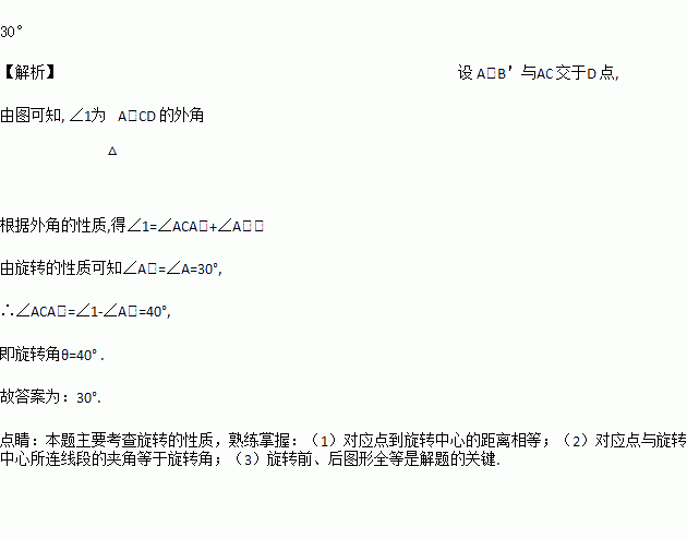 如图,把△ABC绕点C顺时针旋转某个角度后得到△A’B’C,若∠A=40°,∠1=70°,则旋转角等于_____。