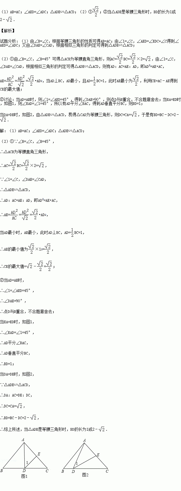 (2)若∠B=45°,BC=2,当点D在BC上运动时(点D不与B、C重合),
