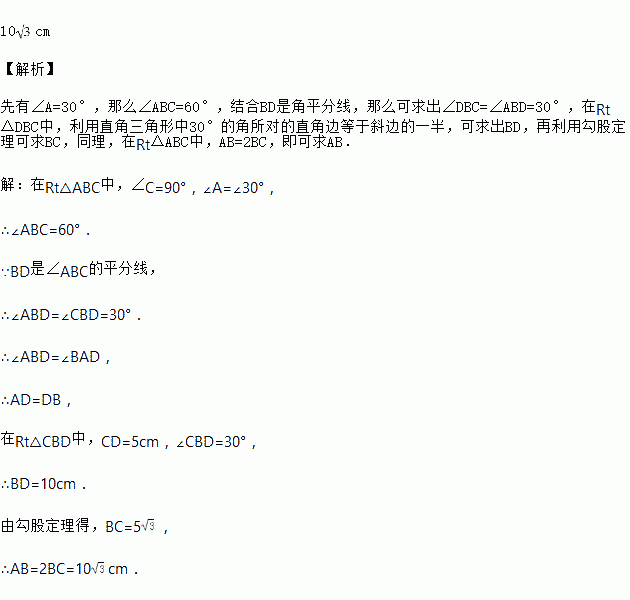 如图,在△ABC中,∠C=90°,∠A=30°,BD是∠ABC的平分线,CD=5cm,求AB的长.