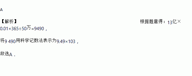 A 【解析】根据题意得:13亿×0.01×365÷50万=9490, 将9 490用科学记数法表示为9.49×103, 故选A.