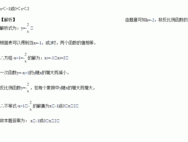 一次函数y=-x+1与反比例函数(k<0)中,x与y的部分对应值如下表:
