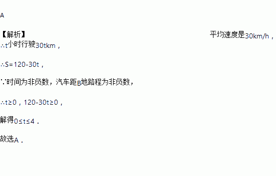 汽车由A地驶往相距120 km的B地,它的平均速度是30 km/h,则汽车距B地的路程s(km)与行驶时间t(h)的函数关系式及自变量t的取值范围是( )