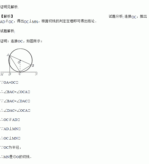 如图,AB是⊙O的直径,C是⊙O上一点,直线MN经过点C,过点A作直线MN的垂线,垂足为点D,且∠BAC=∠DAC.求证:MN是⊙O的切线.