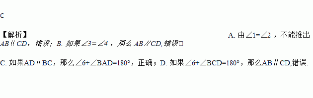 C. 如果AD∥BC , 那么∠6+∠BAD=180°. D. 如果∠6+∠BCD=180°,那么AD∥BC