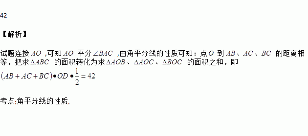 如图,已知△ABC 的周长是21,OB,OC分别平分∠ABC和∠ACB,OD⊥BC于D,且OD=4,△ABC的面积是________.