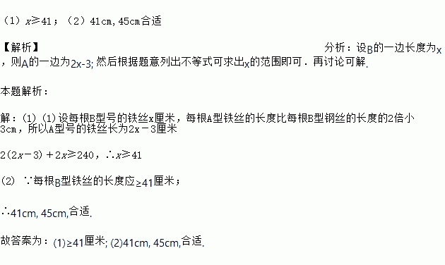 用A、B两种型号的钢丝各两根分别作为长方形的长与宽,焊接成周长不小于2.4m的长方形框架,已知每根A型钢丝的长度比每根B型钢丝长度的2倍少3cm.