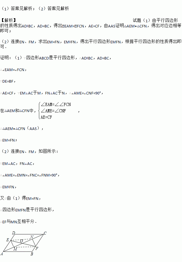 如图,已知E、F分别为平行四边形ABCD的对边AD、BC上的点,且DE=BF,EM⊥AC于M,FN⊥AC于N,EF交AC于点O,