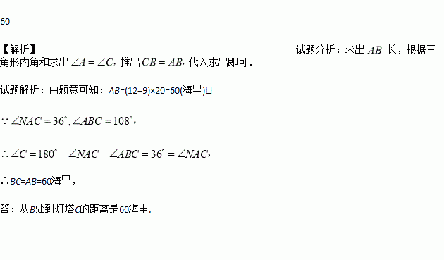 如图,上午9时,一条船从A处出发,以20海里/时的速度向正北航行,12时到达B处,测得∠NAC=36°,∠ABC=108°,求从B处到灯塔C的距离.