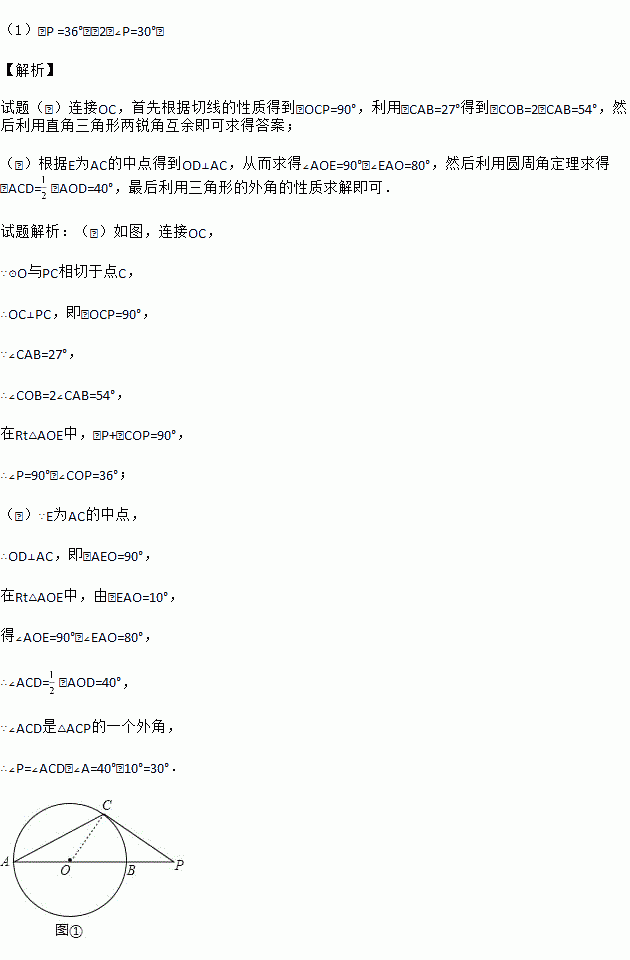 (1)如图1,过点C作⊙O的切线,与AB延长线相交于点P,若∠CAB=27°,求∠P的度数;