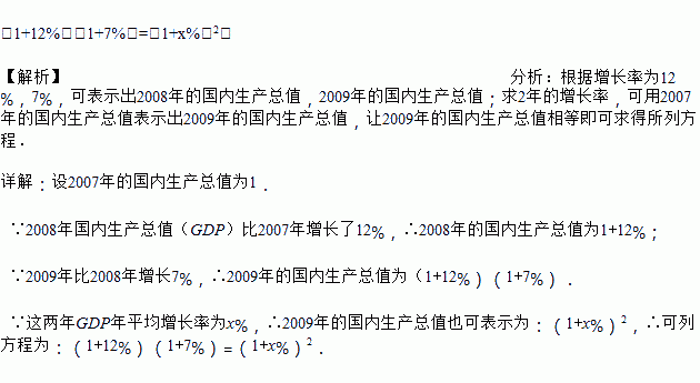 我市2008年国内生产总值(GDP)比2007年增长了12%,由于受到国际金融危机的影响,预计2009年比2008年增长7%,求这两年的平均增长率.若这两年GDP年平均增长率为x%,则可列方程是 .