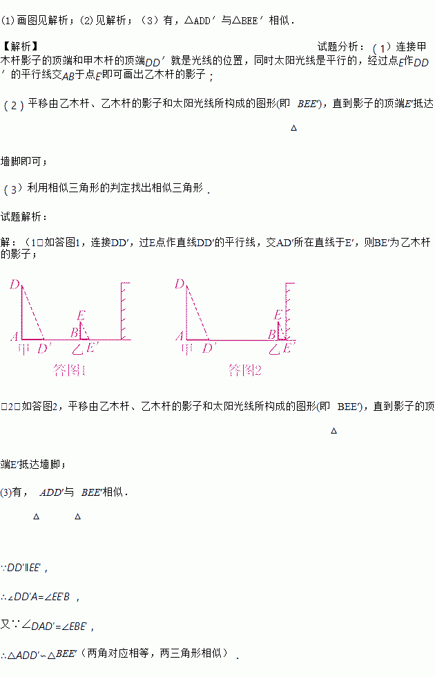 (1)某一时刻甲木杆在阳光下的影子如图所示,你能画出乙木杆的影子吗?(用线段表示影子)