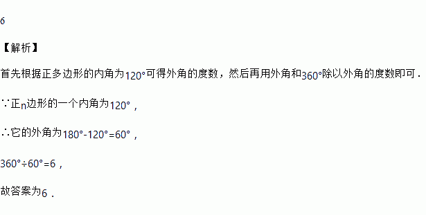 正n边形的一个内角为120°,则n的值为________ .