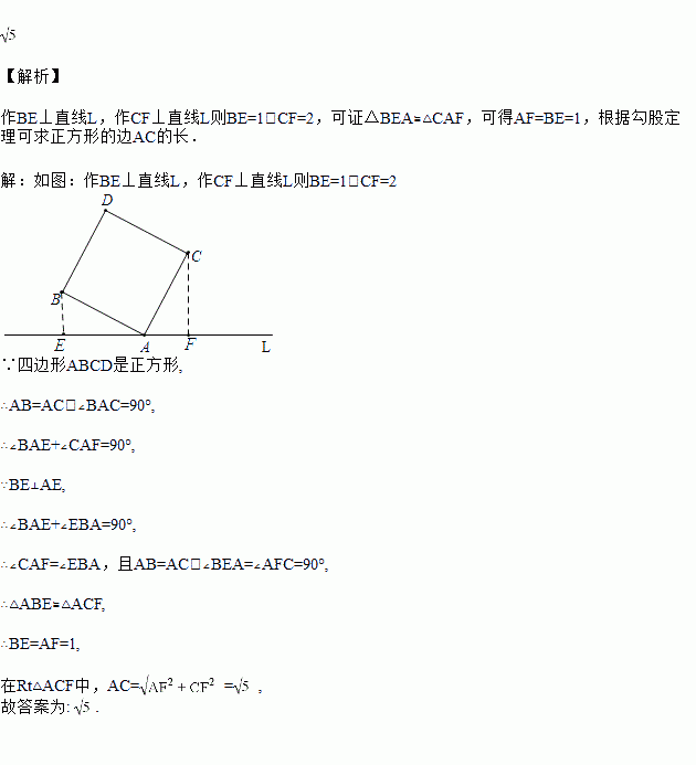 直线L过正方形ABDC的顶点A,点B,C到直线L的距离分别为1和2,则正方形的边长为_____.