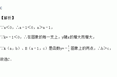 若A(a,b)、B(a﹣1,c)是函数y=-图象上的两点,且a<0,则b与c的大小关系为( )