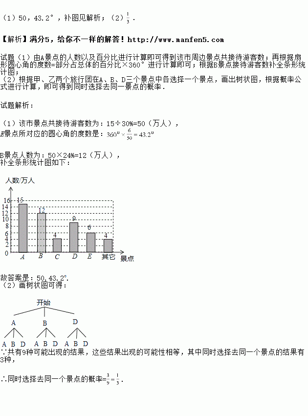 (1)2018年春节期间,该市A,B,C,D,E这五个景点共接待游客 万人,扇形统计图中E景点所对应的圆心角的度数是 ,并补全条形统计图.