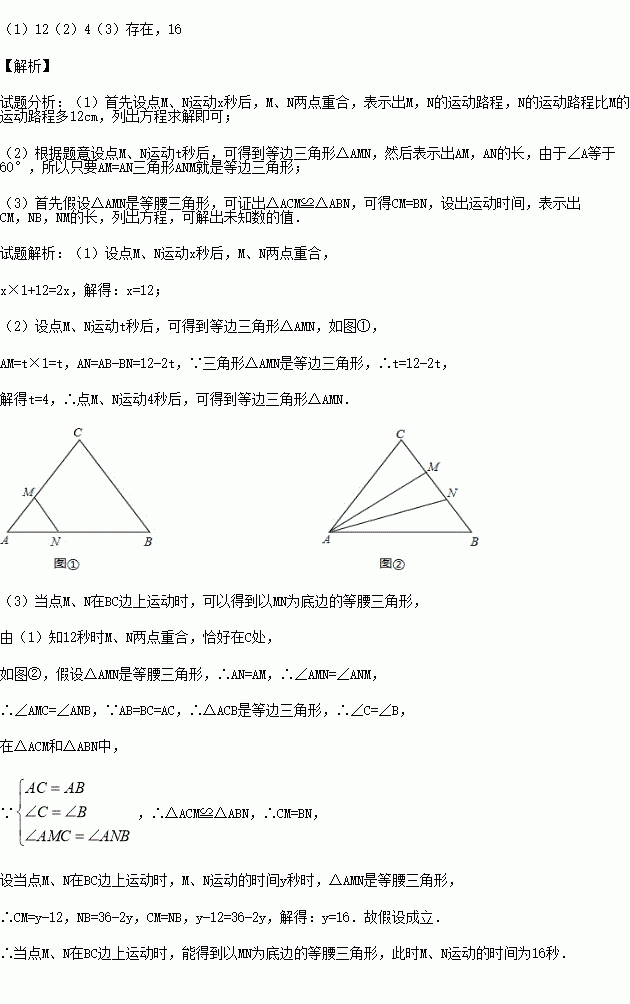 如图,△ABC中,AB=BC=AC=12cm,现有两点M、N分别从点A、点B同时出发,沿三角形的边运动,已知点M的速度为1cm/s,点N的速度为2cm/s.当点N第一次到达B点时,M、N同时停止运动.