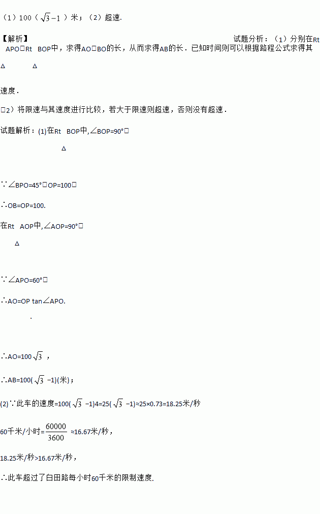 校车安全是近几年社会关注的热门话题,其中超载和超速行驶是校车事故的主要原因.小亮和同学尝试用自己所学的三角函数知识检测校车是否超速,如下图,观测点设在到白田路的距离为100米的点P处.这时,一辆校车由西向东匀速行驶,测得此校车从A处行驶到B处所用的时间为4秒,且∠APO=60°,∠BPO =45°.