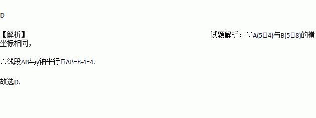 已知点A(5,4),B(5,8),则线段AB的位置特征和AB的长度分别是( )