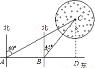 今年入夏以来,松花江哈尔滨段水位不断下降,达到历史最低水位.一条船在松花江某水段自西向东沿直线航行,如图,在A处测得航标C在北偏东60°方向上.前进100米到达B处,又测得航标C在北偏东45°方向上.在以航标C为圆心,120米长为半径的圆形区域内有浅滩.如果这条船继续前进,是否有被浅滩阻碍的危险?(供考生参考的数据: