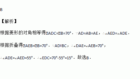 如图,把菱形ABCD沿AH折叠,使B点落在BC上的E点处,若∠B=70°,则∠EDC的大小为( )