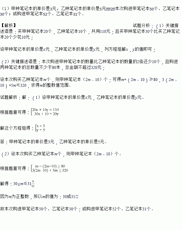 (2)若本次购进甲种笔记本的数量比乙种笔记本的数量的2倍还少10个,且购进两种笔记本的总数量不少于80本,总金额不超过320元.请你设计出本次购进甲、乙两种笔记本的所有方案.