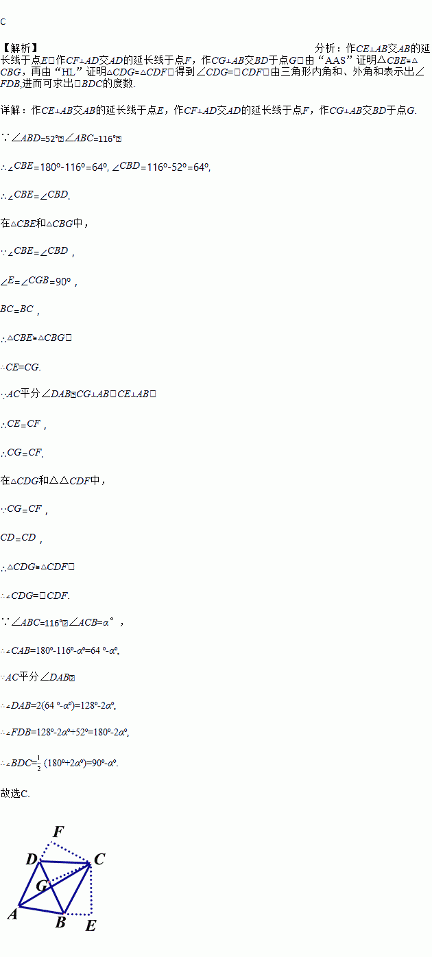 如图,在四边形ABCD中,对角线AC平分∠DAB,∠ABD=52°,∠ABC=116°,∠ACB=α°,则∠BDC的度数为( )
