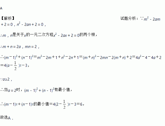 A 【解析】试题分析:∵m2-2am+2=0,n2-2an+2=0, ∴m,n是关于x的一元二次方程x2-2ax+2=0的两个根, ∴m+n=2a,mn=2, ∴(m-1)2+(n-1)2=m2-2m+1+n2-2n+1=(m+n)2-2mn-2(m+n)+2=4a2-4-4a+2=4(a-)2-3, ∵a≥2, ∴当a=2时,(m-1)2+(n-1)2有最小值...