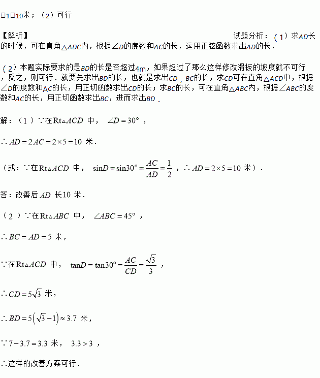 £¨1£©10Ã×£»£¨2£©¿ÉÐÐ ¡¾½âÎö¡¿ÊÔÌâ·ÖÎö£º£¨1£©ÇóAD³¤µÄʱºò£¬¿ÉÔÚÖ±½Ç¡÷ADCÄÚ£¬¸ù¾Ý¡ÏDµÄ¶ÈÊýºÍACµÄ³¤£¬ÔËÓÃÕýÏÒº¯ÊýÇó³öADµÄ³¤£® £¨2£©±¾Ìâʵ¼ÊÒªÇóµÄÊÇBDµÄ³¤ÊÇ·ñ³¬¹ý4m£¬Èç¹û³¬¹ýÁËÄÇôÕâÑùÐ޸Ϭ°åµÄÆÂ¶È¾Í²»¿ÉÐУ¬·´Ö®£¬Ôò¿ÉÐУ®¾ÍÒªÏÈÇó³öBDµÄ³¤£¬Ò²¾ÍÊÇÇó³öCD£¬BCµÄ³¤£¬ÇóCD¿ÉÔÚÖ±½Ç¡÷ACDÖУ¬¸ù¾Ý¡ÏDµÄ¶ÈÊýºÍACµÄ³¤£¬ÓÃÕýÇк¯ÊýÇó³öCDµÄ³¤£»ÇóBCµÄ³¤£¬¿ÉÔÚÖ±½Ç¡÷AB...