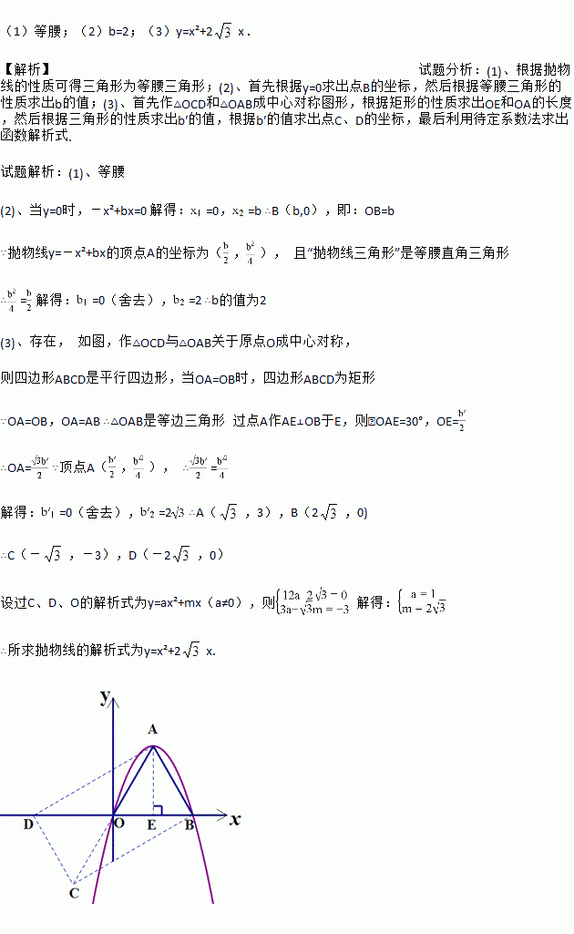 (3)如图,△OAB是抛物线y=-x2+b′x(b′>0)的“抛物线三角形”,是否存在以原点O为对称中心的矩形ABCD?若存在,求出过O、C、D三点的抛物线的表达式;若不存在,说明理由.