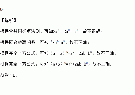 A. 3a2﹣2a2=1 B. a2•a3=a6 C. (a﹣b)2=a2﹣b2 D. (a+b)2=a2+2ab+b2