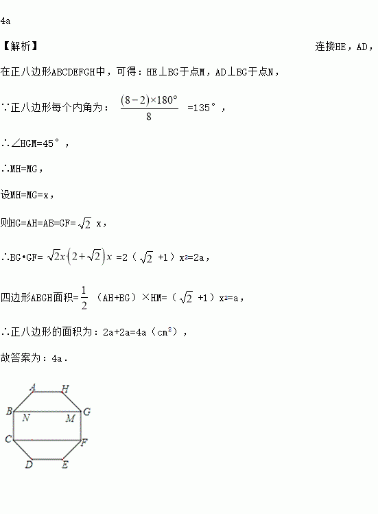 如图,在正八边形ABCDEFGH中,四边形BCFG的面积为2acm2,则正八边形的面积_____cm2 (用a的代数式表示).