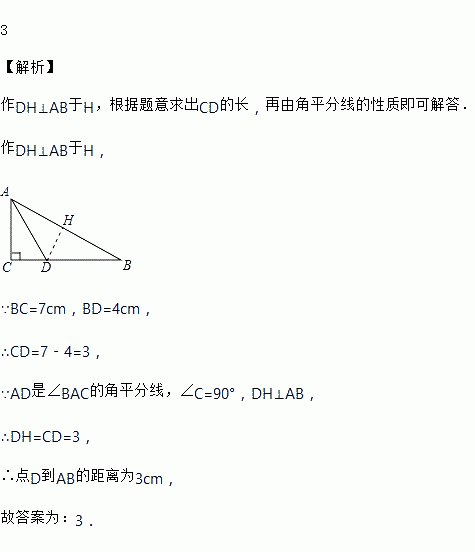 如图,在△ABC中,∠C=90°,AD是∠BAC的角平分线,若BC=7cm,BD=4cm,则点D到AB的距离为_____cm.