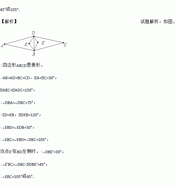 在菱形ABCD中,∠A=30°,在同一平面内,以对角线BD为底边作顶角为120°的等腰三角形BDE,则∠EBC的度数为 .