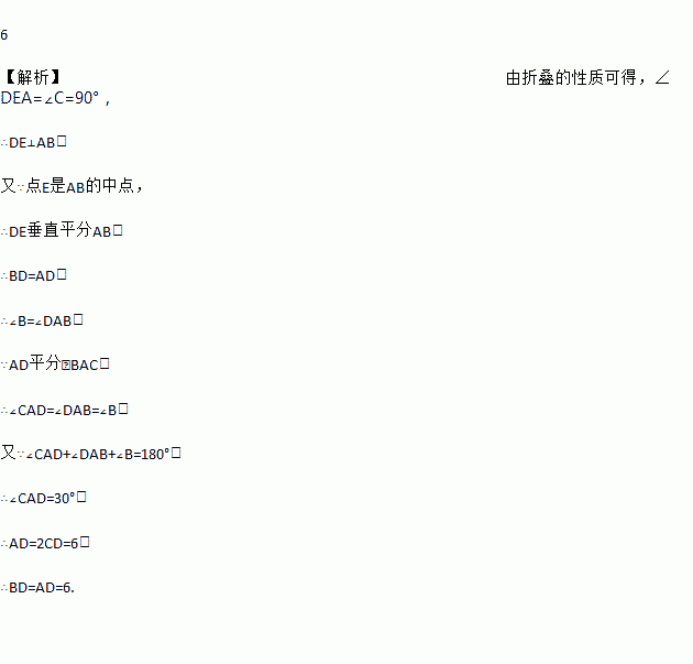 如图:△ABC中,∠C=90°,AD 平分∠BAC交CB于点D.现将直角边AC沿直线AD折叠,AC边恰好落在斜边上,且点C与斜边AB的中点E刚好重合,若CD=3,则BD=________________.
