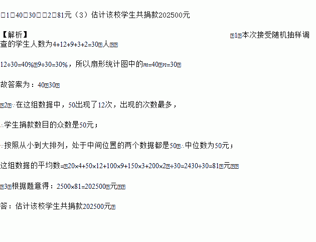 (3)若该校有学生2500人,估计该校学生共捐款多少元?