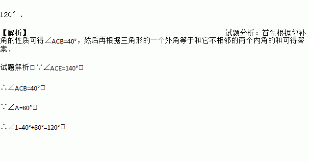 如图△ABC,延长CB到D,延长BC到E,∠A=80°,∠ACE=140°求∠ABD的度数.