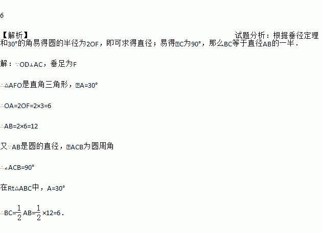如图,A,B,C三点在⊙O上,且AB是⊙O的直径,半径OD⊥AC,垂足为F,若∠A=30°,OF=3,则BC=______.