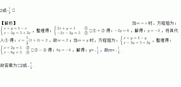 关于x、y的二元一次方程组中,m与方程组中的x或y相等,则m的值为________.
