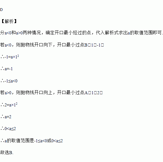 如图,在平面直角坐标系中,A(1,2),B(1,﹣1),C(2,2),抛物线y=ax2(a≠0)经过△ABC区域(包括边界),则a的取值范围是( )