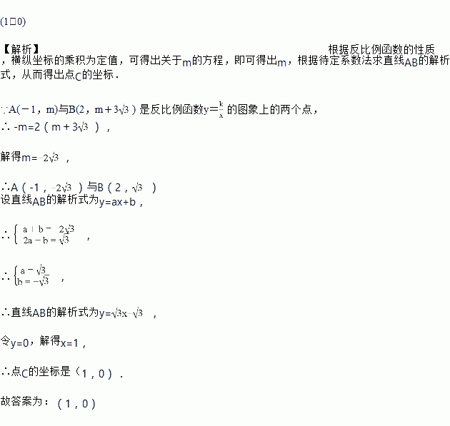 如图所示,已知A(-1,m)与B(2,m+3)是反比例函数y=的图像上的两个点,C是直线AB与x轴的交点,则点C的坐标是________.