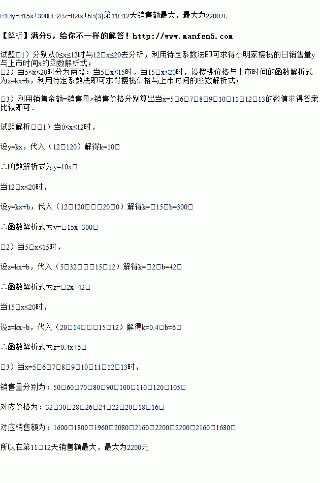 (2)求当5≤x≤20时,樱桃的价格z与上市时间x的函数解析式.