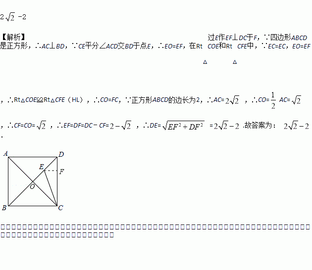 如图,已知正方形ABCD的边长为2,连接AC、BD,CE平分∠ACD交BD于点E,则DE=_______.