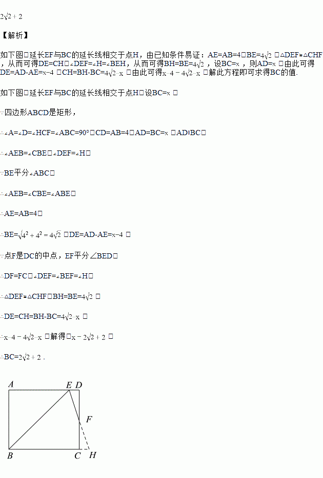 如图,在矩形ABCD中,∠B的平分线BE与AD交于点E,∠BED的平分线EF与DC交于点F,当点F是CD的中点时,若AB=4,则BC=_________.