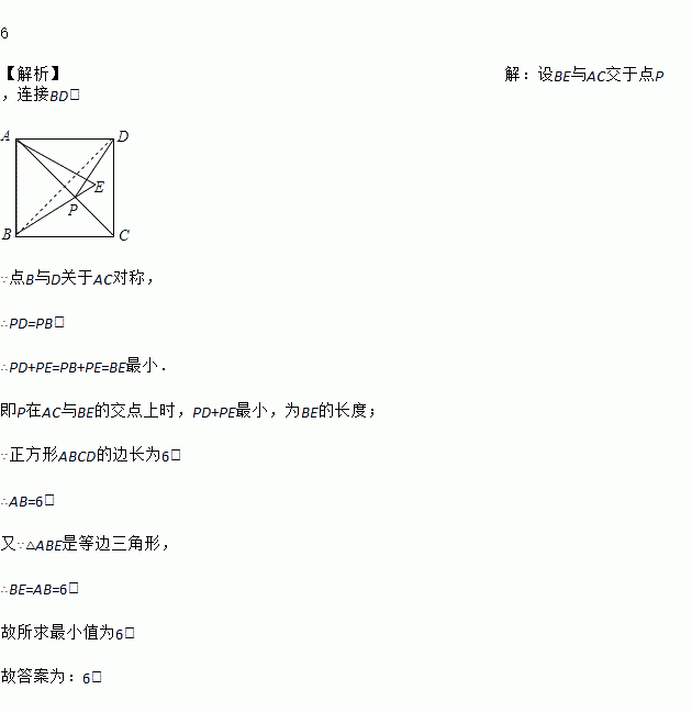 如图所示,正方形ABCD的边长为6,△ABE是等边三角形,点E在正方形ABCD内,在对角线AC上有一点P,使PD+PE的和最小,则这个最小值为_____.