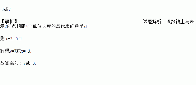 -3或7 【解析】试题解析:设数轴上与表示2的点相距5个单位长度的点代表的数是x, 则|x?2|=5, 解得x=7或x=?3. 故答案为:7或?3.