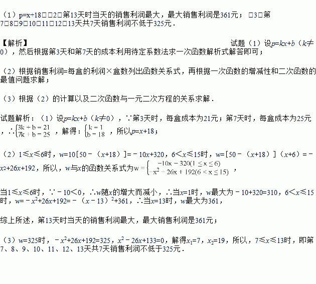 铁岭“荷花节”举办了为期15天的“荷花美食”厨艺秀.小张购进一批食材制作特色美食,每盒售价为50元,由于食材需要冷藏保存,导致成本逐日增加,第x天(1≤x≤15且x为整数)时每盒成本为p元,已知p与x之间满足一次函数关系;第3天时,每盒成本为21元;第7天时,每盒成本为25元,每天的销售量为y盒,y与x之间的关系如下表所示: