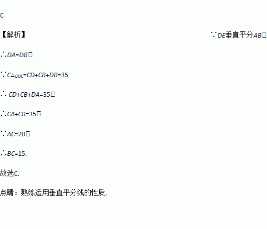 如图,在△ABC中,AB=AC=20cm,DE垂直平分AB,垂足为E,交AC于D,若△DBC的周长为35cm,则BC的长为( )