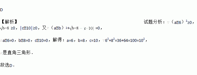 D 【解析】试题分析:∵(a﹣6)2≥0,≥0,|c﹣10|≥0,又∵(a﹣b)2+=0, ∴a﹣6=0,b﹣8=0,c﹣10=0,解得:a=6,b=8,c=10,∵62+82=36+64=100=102, ∴是直角三角形. 故选D.