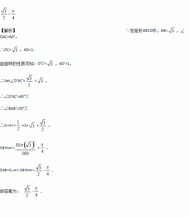 ,∠DAC=60°,把该矩形绕点A顺时针旋转α度得矩形AB′C′D′,点C′落在AB的延长线上,则图中阴影部分的面积是______.